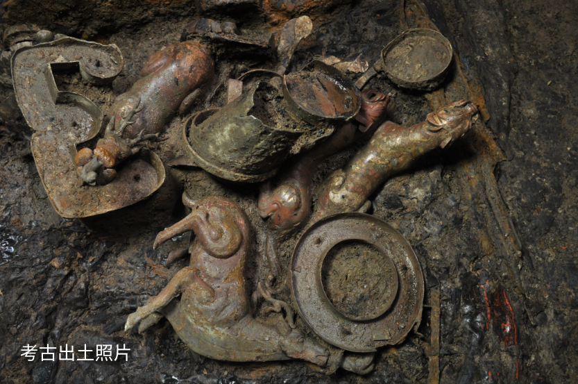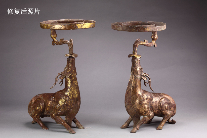 整器由灯盘(碾)、灯罩、灯盖、釭四部分构成。釭形如鼎,直领圆腹,圜底,三兽蹄形附足。釭肩部左右各伸出一对向上弯曲状烟管,与灯盖两根向下烟管相连。灯盘下有圈足,与釭口沿相接。灯罩由两片相同大小片状弧形铜板组成,可自由开合。釭肩部刻有一道铭文,内容为“江都宦者并重一钧三斤容三斗三升”。