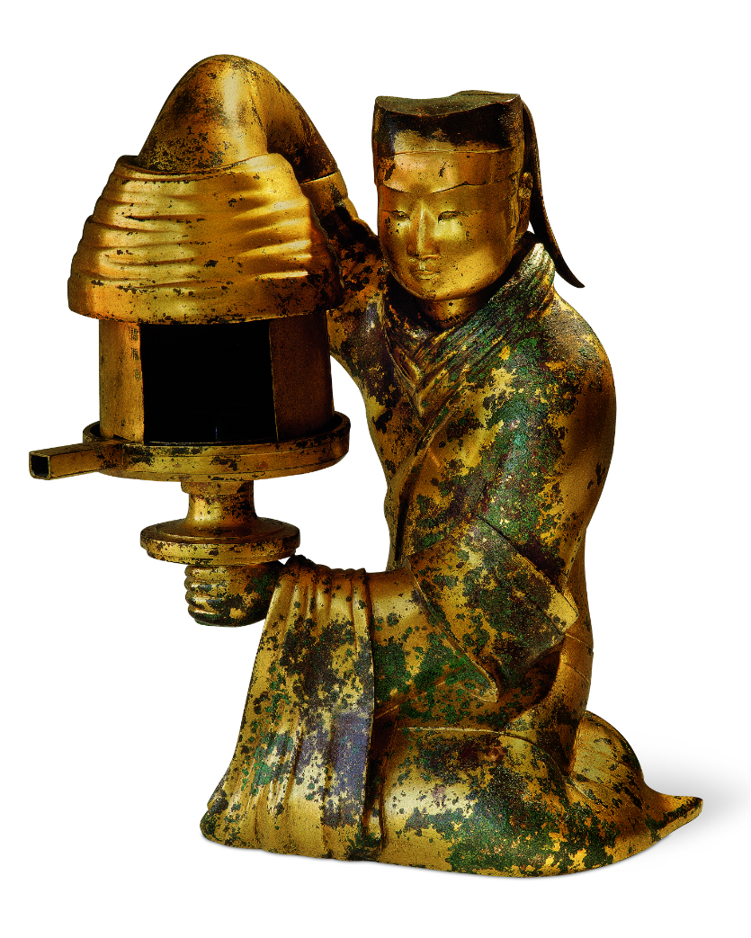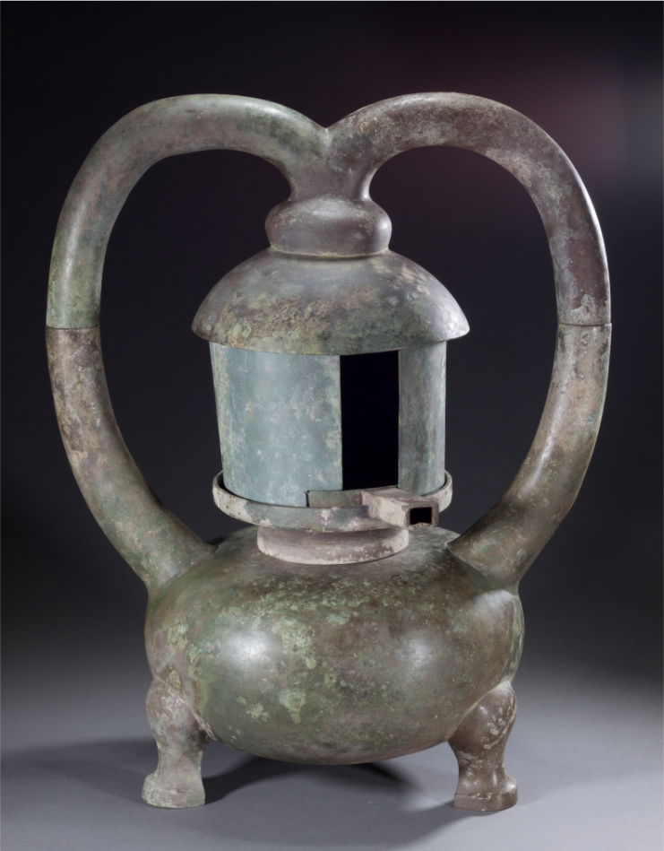 此件釭灯设计颇为精巧,其各部件均可自由拆卸组装。使用时,釭内置水,灯盘内燃烧过的灯烟通过双管导入釭内,灯烟便溶于水中,保持室内清洁。灯盘外插饰有两块半圆形挡光板,板可自由开合,光线则可根据需要调节方向与照明度。